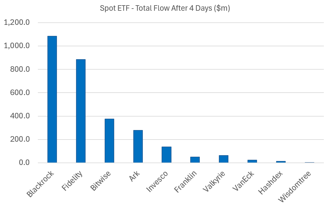 排名前三的是:贝莱德(10.85亿美元)、富达(8.84亿美元)、Bitwise(3.75亿美元)。