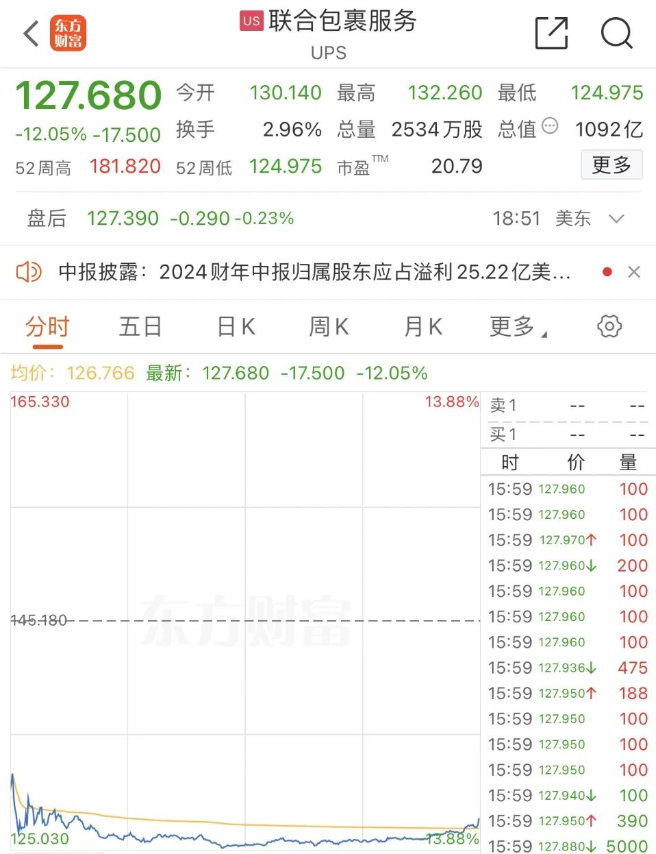 隔夜美股盘中,全球快递业巨头——联合包裹(UPS)股价一度暴跌近14%,创2008年10月以来最大盘中跌幅,截至收盘,跌幅仍高达12%,总市值缩水至1092.4亿美元(约合人民币7900亿元),单日总市值蒸发150亿美元(约合人民币1100亿元)。