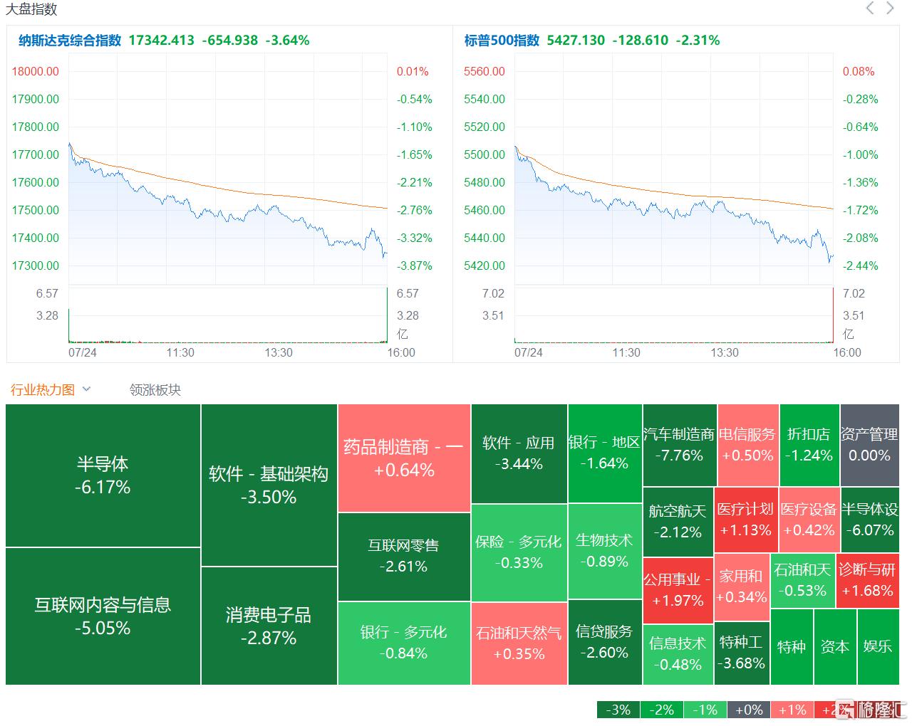 纳指也遭遇重挫,跌3.64%,创2022年10月以来最大单日跌幅,收于6月10日以来的最低点。