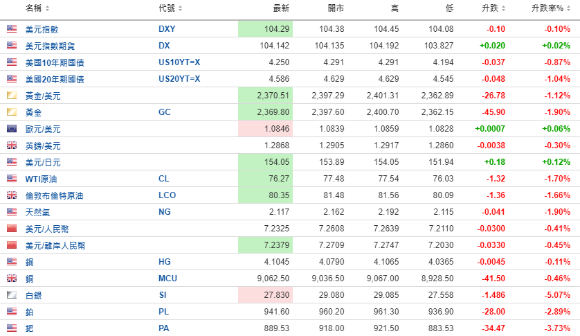 美元指数期货、美元指数于104关口上方震荡。