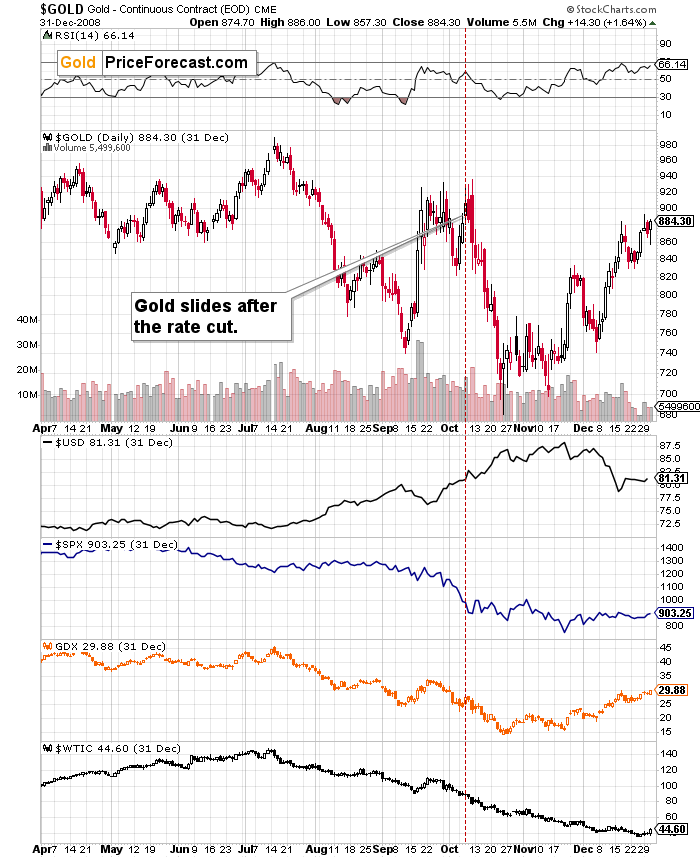 特别值得关注的是2008年——在2008年10月降息后,黄金价格骤跌,黄金股也一样。2020年的情况也相当有趣。