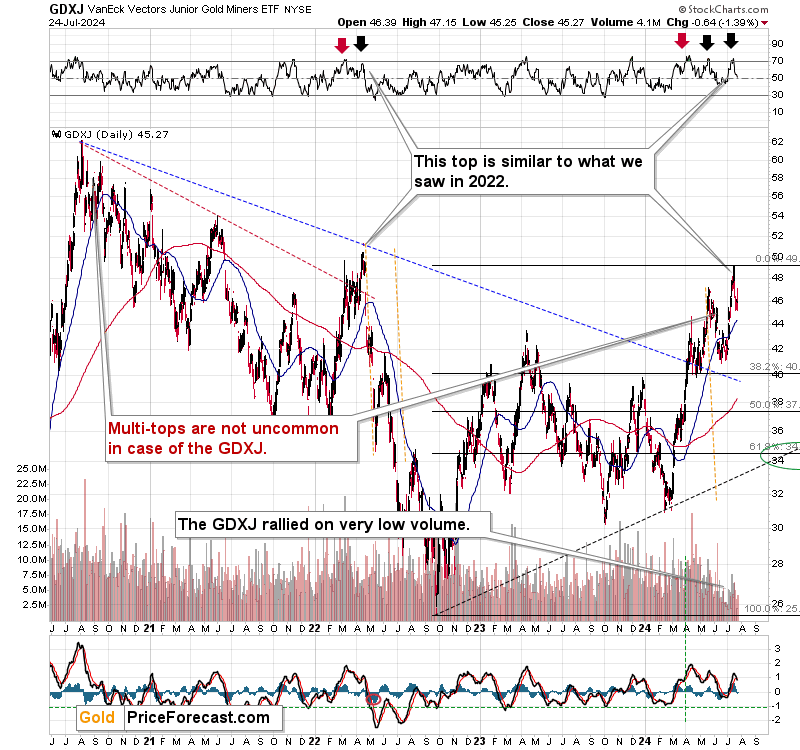 GDXJ成功重新测试了位于5月高点的阻力位,更清楚地表明,下一个大动作很可能是向下。