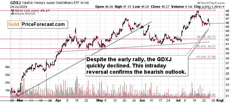 与此相呼应的是,VanEck Junior Gold Miners ETF (NYSE:GDXJ) 的走势也逆转了,尽管周三早市有所上涨,但最终下跌超过1%。由于黄金和白银前景看跌,自然地也能预期矿业股将会进一步下跌。