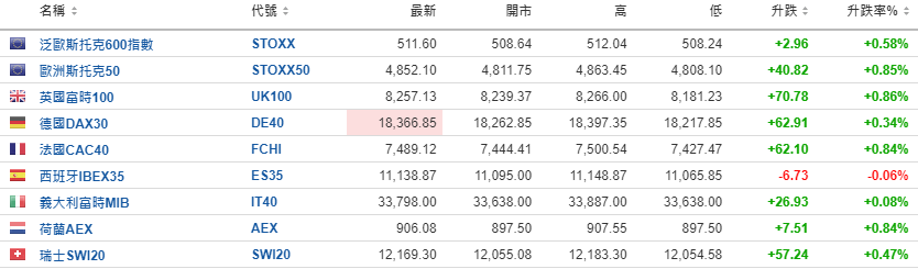 欧洲股市多数上升。
