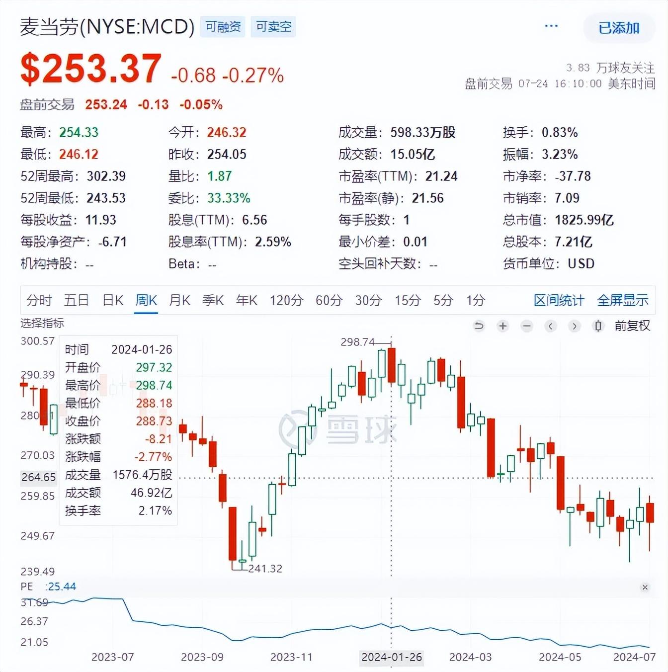 对于这种全球化已经渗透率到极致的公司,很难通过开拓新市场或者其他手段来取得超额成长。而跟Ai股相比,这些餐饮股也没什么长期增长预期和故事可说,完全就是看财报定价,在当前的利率条件,切换到低个位数增速时,自然会迎来估值大调整。一向长牛的麦当劳也因此背离了指数,回到了久违的20PE。