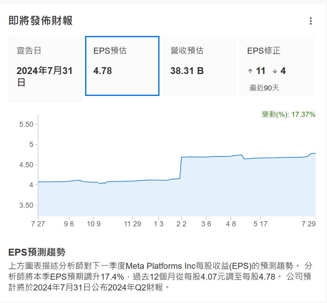 根据InvestingPro工具预估,Meta第二季度的每股收益将达到4.78美元,同比增长60.4%。此外,Meta的收入和每股收益已经连续四个季度超过了市场普遍预期。