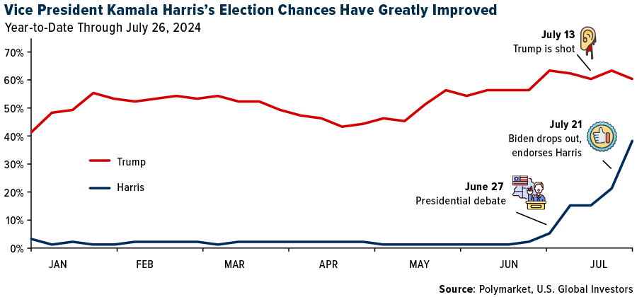 据贺锦丽的竞选团队透露,她在竞选首周就筹集到了令人瞠目结舌的2亿美元,如果属实,无疑将创下一个新的纪录。在线博彩平台Polymarket的用户现在认为,贺锦丽在11月大选中的获胜概率已从一个月前的1%飙升至38%。
