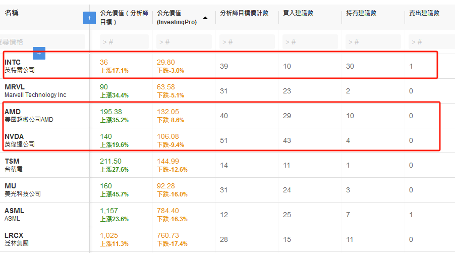 InvestingPro显示,分析师最看升AMD,然而股指模型认为当前三只芯片股都没有什么上升空间。