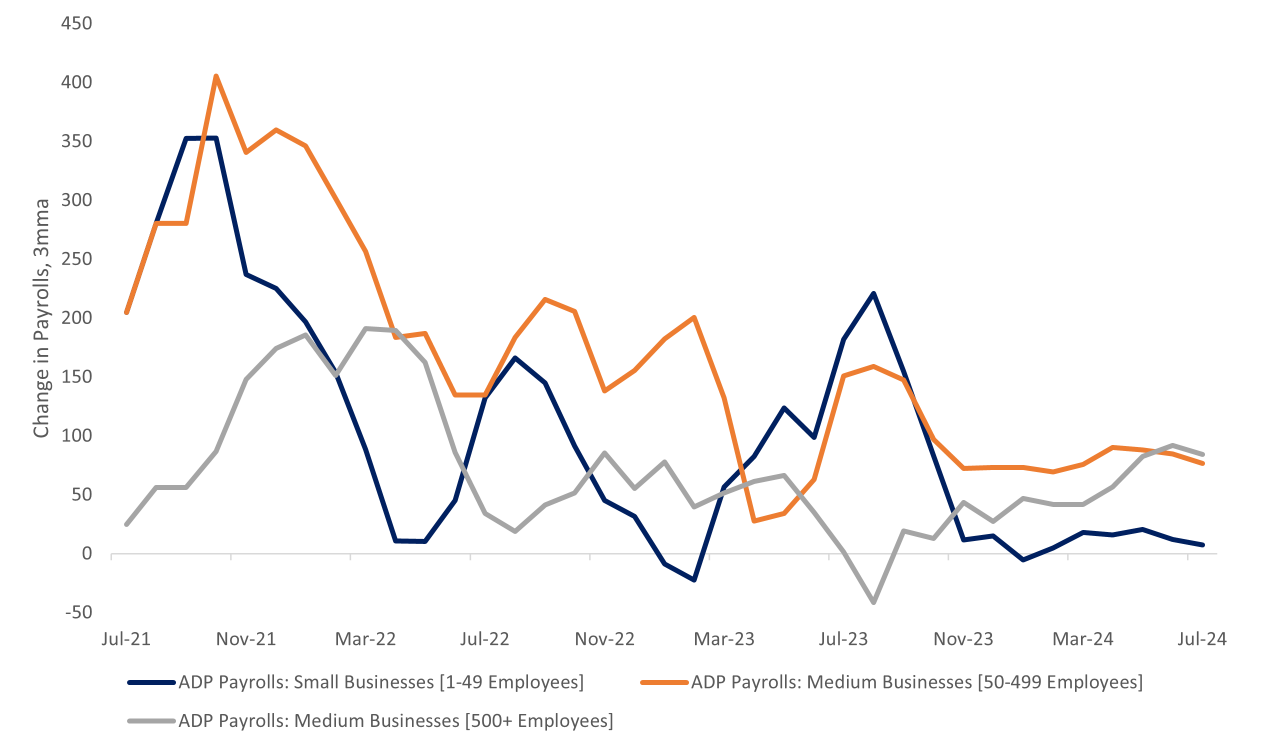 从今日发布的自动数据处理公司(ADP)报告来看,经济活动的放缓对小型企业的影响尤为明显。小型企业的薪资增长速度远低于大型企业,凸显出小型企业在当前经济环境下的脆弱性。