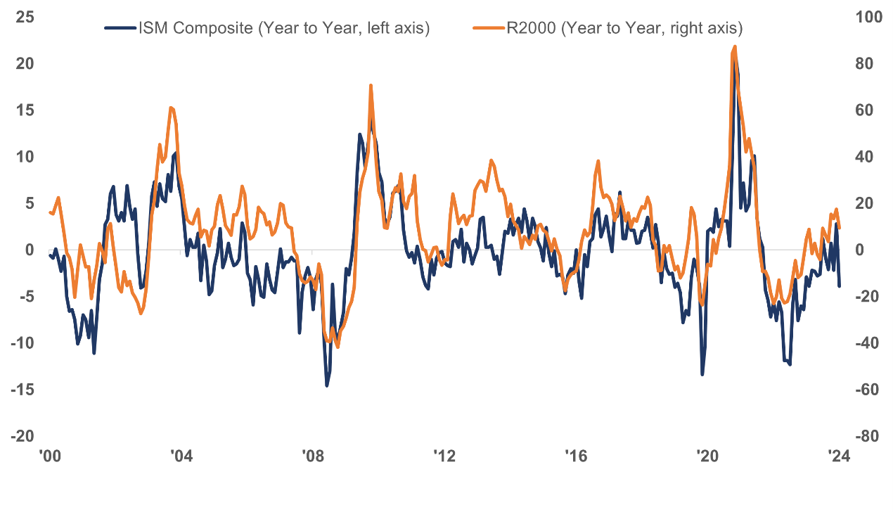 过去几年间,罗素2000指数与供应管理协会(ISM)的综合指数之间保持着紧密的关联。投资者应密切关注ISM数据,将其视为领先指标。