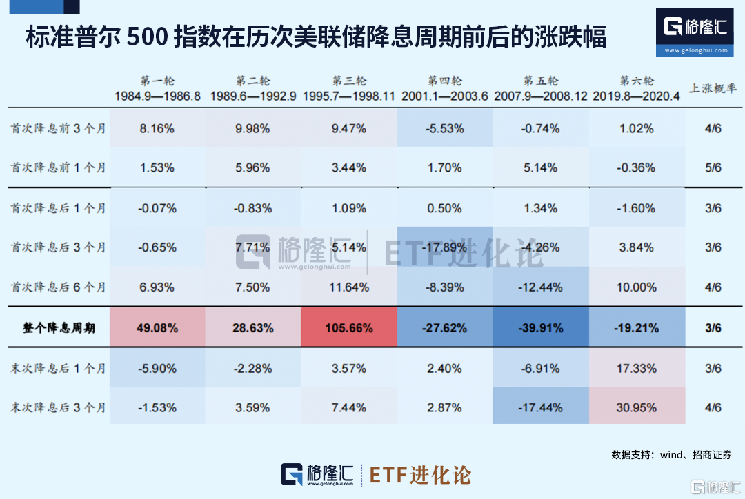 从1984年9月以后的六次降息周期来看,美国标准普尔500指数期间的表现属于55开,三次下跌,三次上涨。