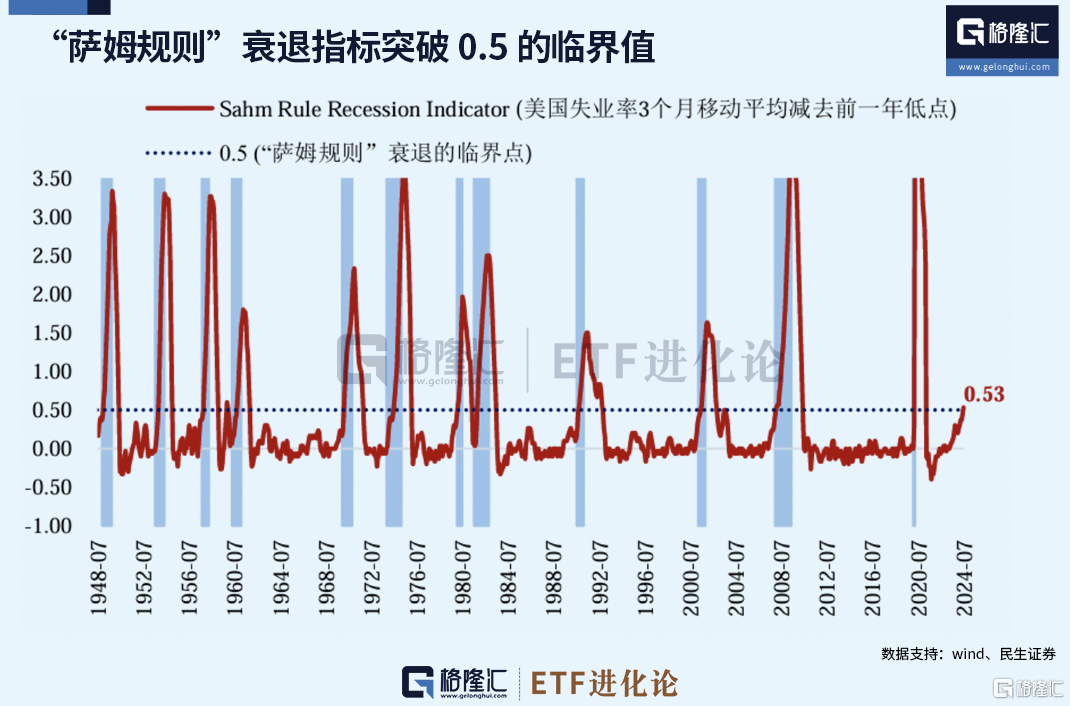 8月2日晚的非农数据再次给市场当头一棒。失业率环比上行0.2%至4.3%,触发“预测经济衰退准确率高达惊人100%”的萨姆规则,即三个月平均失业率比过去12个月的最低值高0.5个百分点意味着美国经济进入衰退。