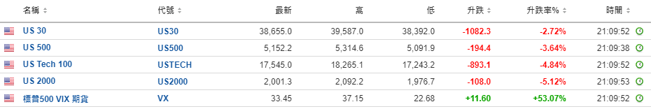 英为财情Investing.com - 周一(5日)盘前,美股延续大跌态势,道指期货跌超100点,纳指期货跌约900点,苹果暴跌7%,英伟达跌13%,特斯拉跌8%,谷歌、亚马逊、Meta无一幸免。