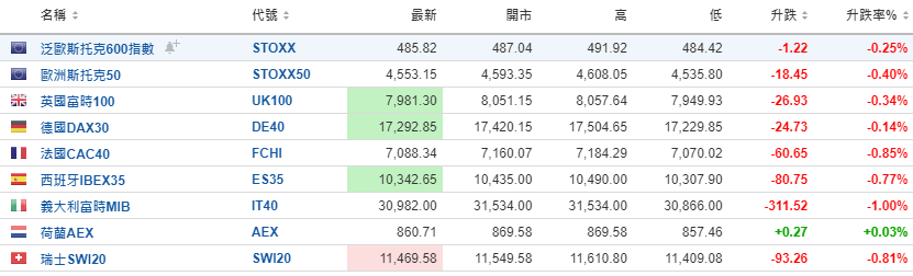 欧洲股市续跌,惟跌势有所放缓。