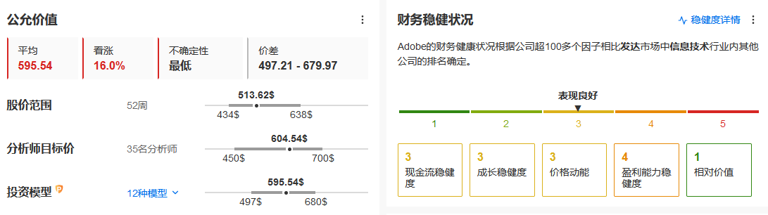 根据InvestingPro基于人工智能的「预估公允价值」模型,Adobe被严重低估,其股价较预估公允价值595.54美元有16%的上涨空间。