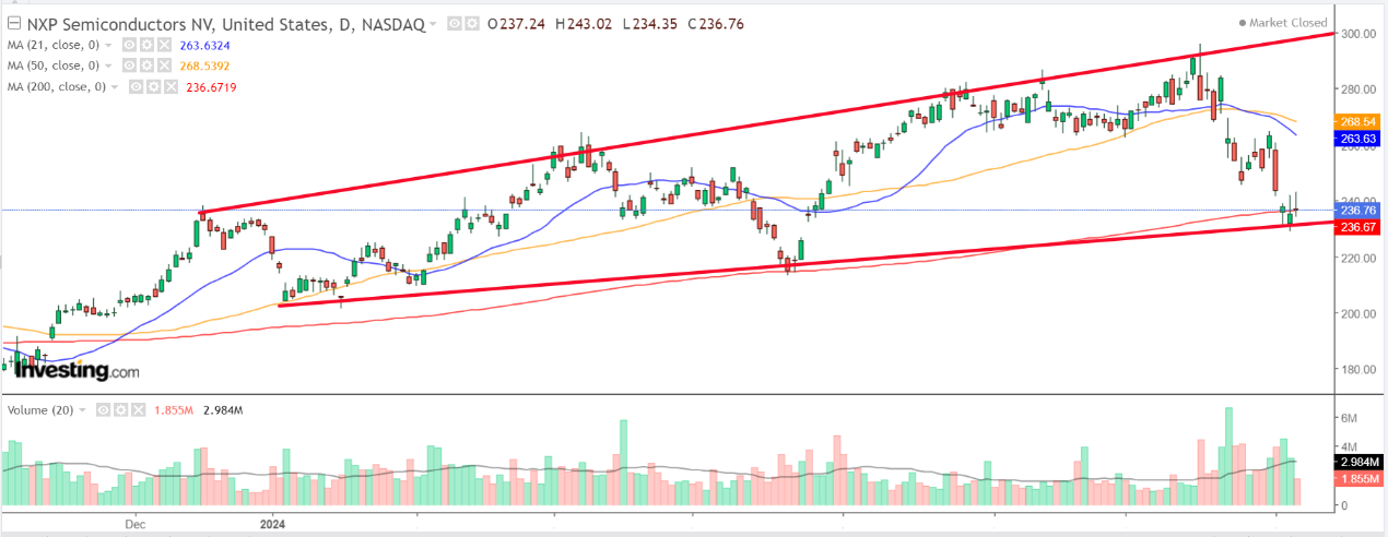 恩智浦半导体公司(NASDAQ:NXPI)是全球领先的半导体制造商,专注于为汽车、工业、移动和通信基础设施市场生产芯片。该公司产品广泛应用于高级驾驶辅助系统(ADAS)、安全联网汽车、网络安全以及物联网(IoT)等领域,是这些高科技应用不可或缺的一部分。