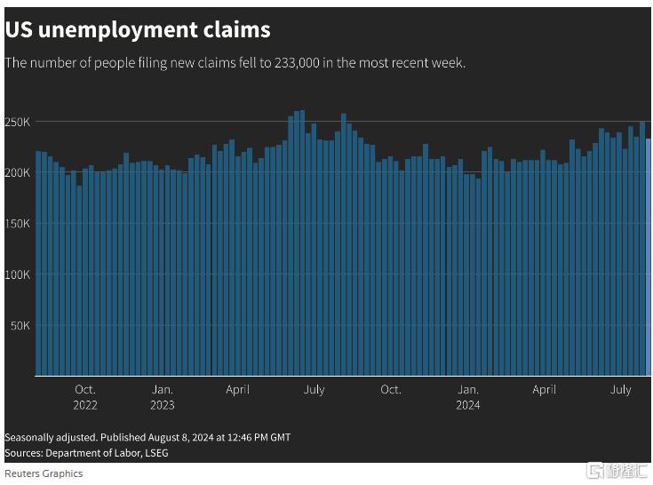 截至8月3日当周,首次申请失业救济人数经季节性调整后下降1.7万人,至23.3万人,为11个月以来的最大降幅,而经济学家此前的预期为24 万人。