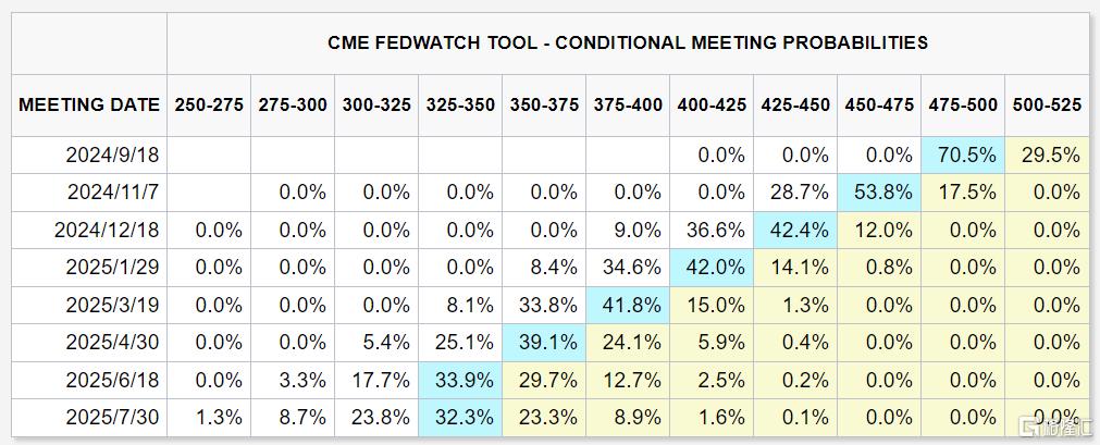 据CME美联储观察工具显示,目前交易员预计美联储9月降息的概率为70.5%,市场则预计首次降息为50个基点。