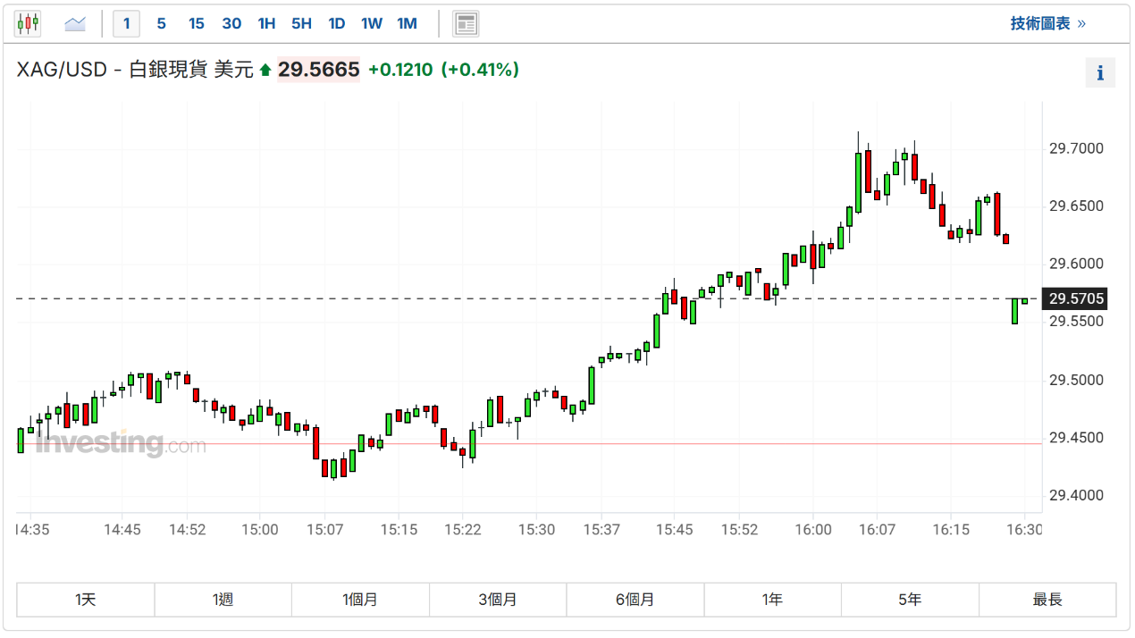 白银上涨势头紧随黄金!截至香港时间16:27(美国东部时间凌晨4:27),Investing.com大宗商品行情显示,XAG/USD价格涨0.41%,报29.5665美元/盎司;白银期货价格涨1.15%,报29.642美元/盎司。