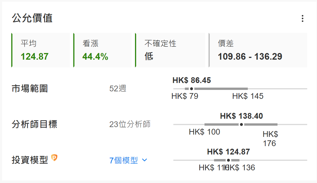 根据InvestingPro工具显示,百度公允价值达124.87港元,近期23位分析师预测的目标均价为138.4港元,均高于上一个交易日收盘价85港元,显示股价低估,仍存在近47%的上涨空间。