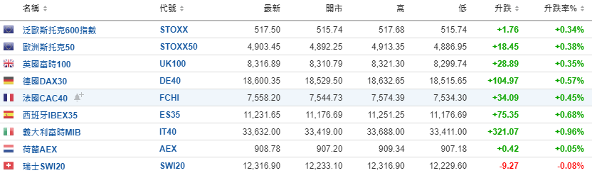 蔚来汽车(NYSE:NIO)(HK:9866)升0.7%,理想汽车(NASDAQ:LI)(HK:2015)升0.4%,小鹏汽车(NYSE:XPEV)(HK:9868)升0.7%。
