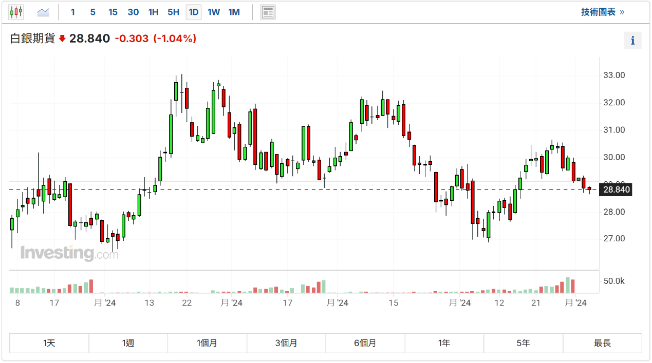 白银期货日内跌超1%,报28.84美元/盎司。受疲弱的中国8月制造业PMI数据影响,工业需求拖累令白银价格大幅下挫,CMX白银期货价格跌破29美元/盎司整数关口。