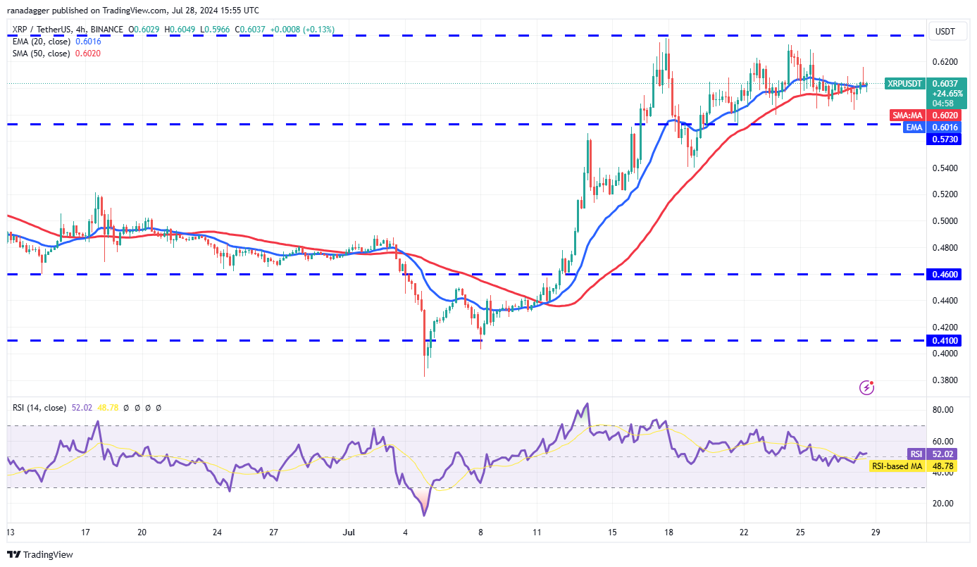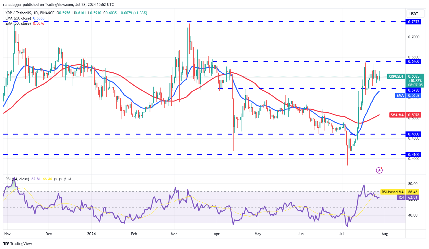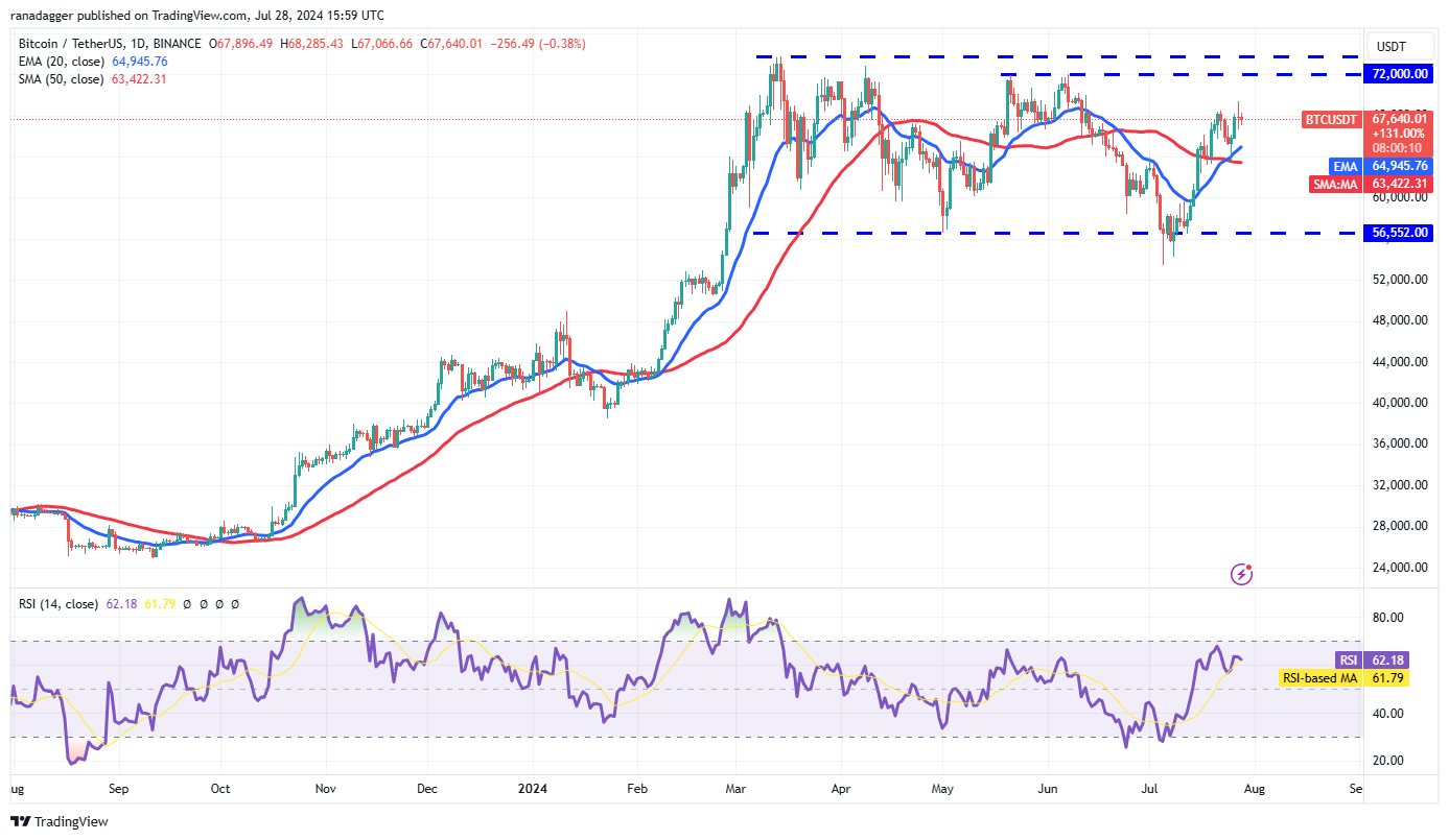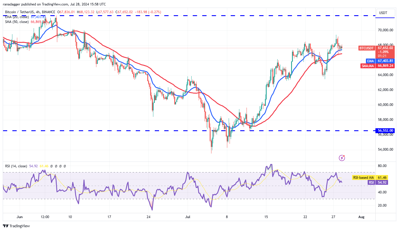 20 日指数移动平均线(64,945 美元)呈上坡趋势,相对强弱指数 (RSI) 处于正值区域,表明阻力最小的路径是向上。如果价格从当前水平上涨或从 20 日 EMA 反弹,多头将再次尝试突破 70,000 美元的障碍。如果成功,BTC/USDT 对可能会达到 72,000 美元至 73,777 美元的阻力区。