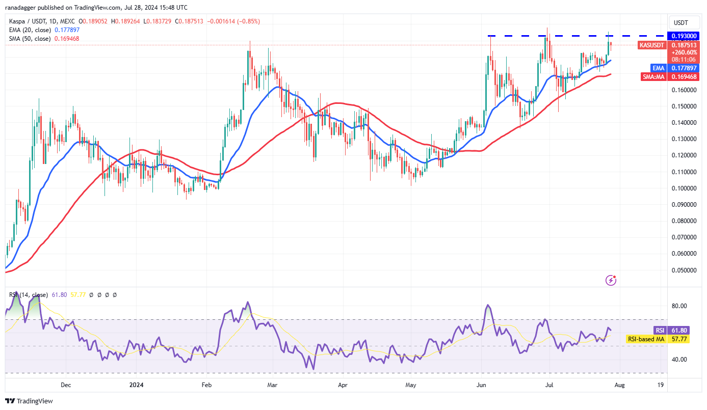 7 月 27 日,多头试图推动 Kaspa ( KAS ) 突破 0.19 美元的上方阻力位,但空头挫败了他们的尝试。