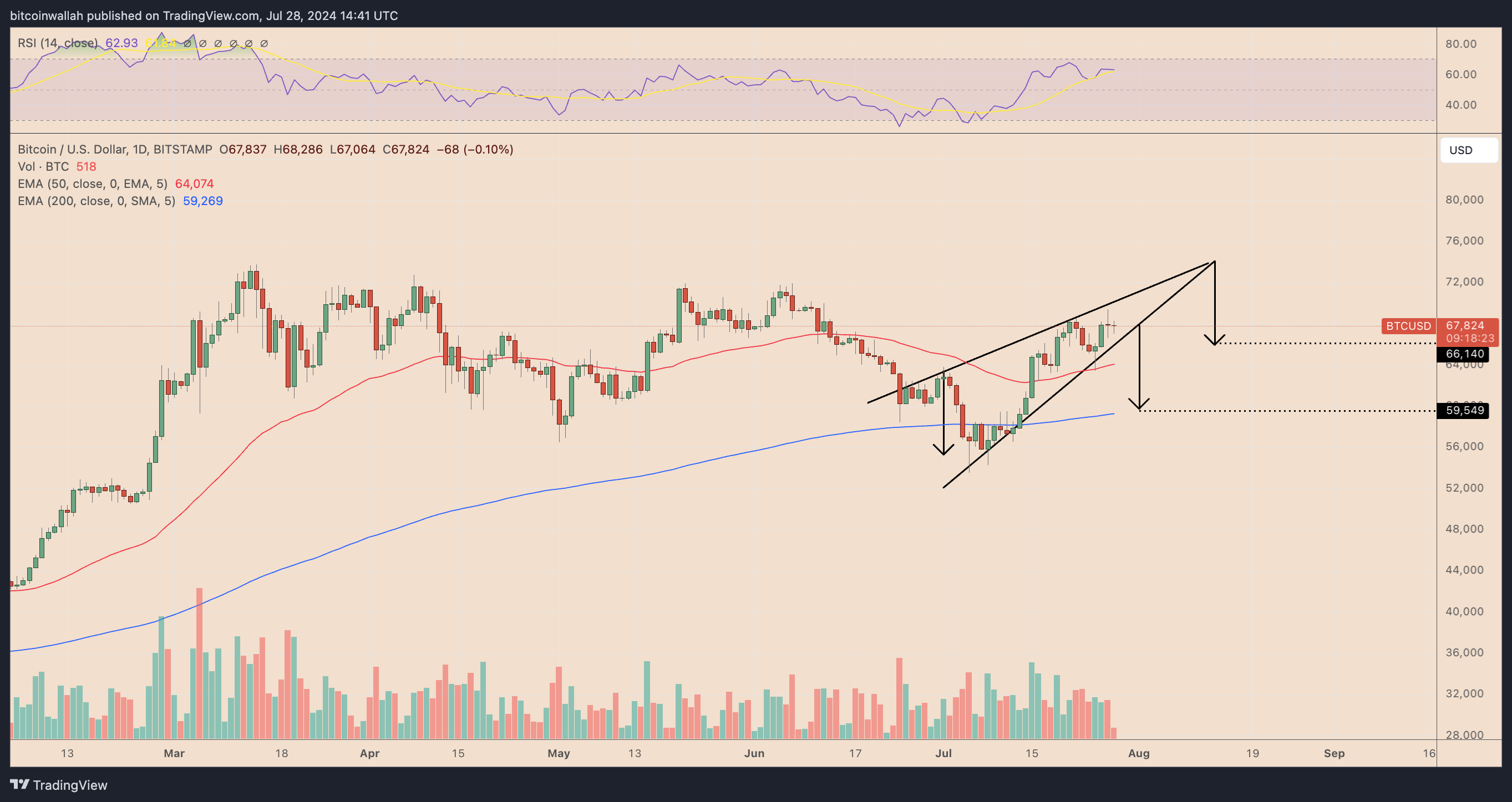 比特币的波动价格走势发生在 BTC 当前的上升楔形模式内,表明到 8 月份将反弹至 74,000 美元。这一水平比当前价格水平上涨了 9.30%,是楔形的两条趋势线的交汇点。