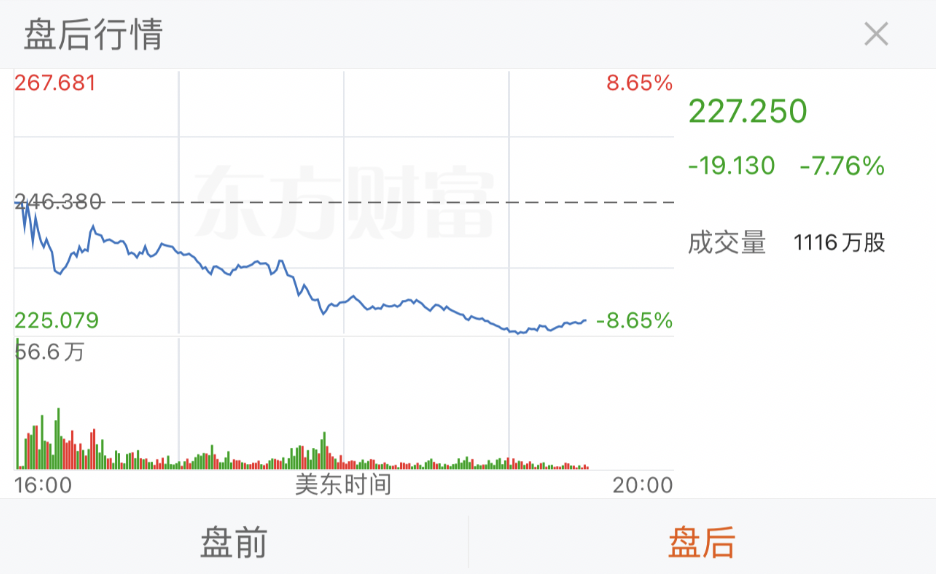 财报公布后,特斯拉股价盘后加速下跌,盘后跌幅扩大到4%以上,电话会上特斯拉CEO马斯克讲话期间,盘后跌幅进一步扩大,一度暴跌超8%。