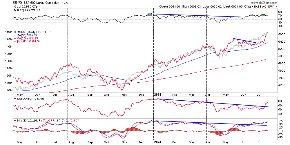 更重要的是,市场广度显著改善,纽约证券交易所的涨跌比率线达到了历史最高水平。此前相对强弱指数(RSI)和标普500指数中超过50日移动平均线的股票数量的负向背离也逆转向上。