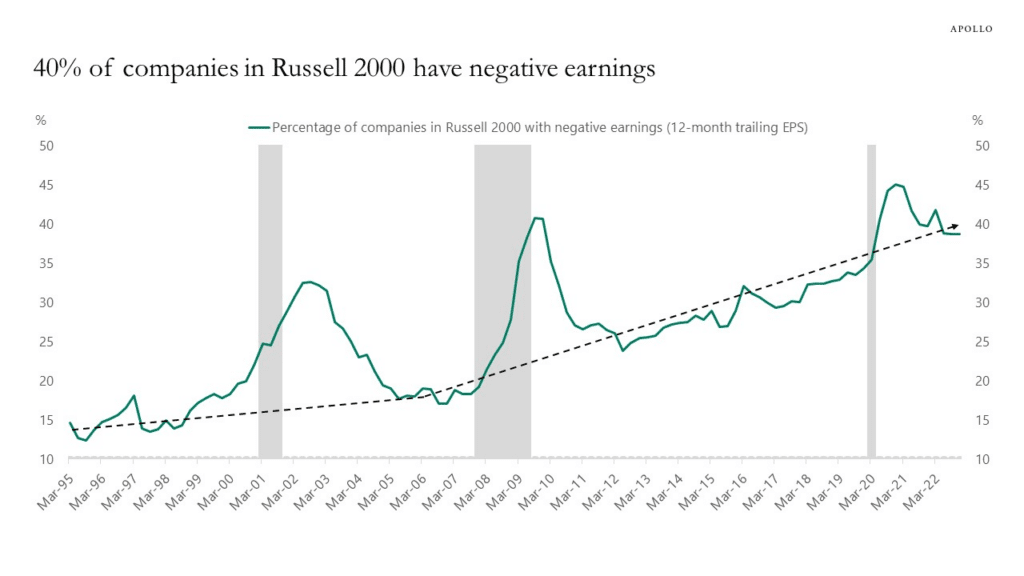 首先,罗素2000指数中近40%的公司尚未盈利。