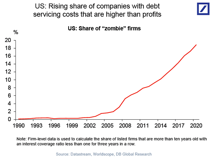 除了散户投资者大量追涨越来越多不盈利的公司,这些公司负债还很高,依赖发债来维持运营(即所谓的僵尸企业),同时极易受到实体经济变化的影响。