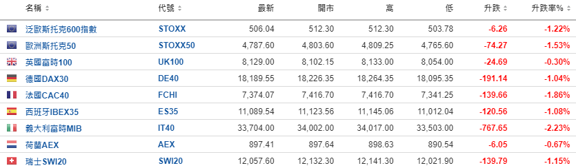 欧洲股市普跌,欧洲基准指数泛欧斯托克600指数跌1.2%,泛欧斯托克50指数挫1.5%,法国CAC 40指数大跌1.8%。