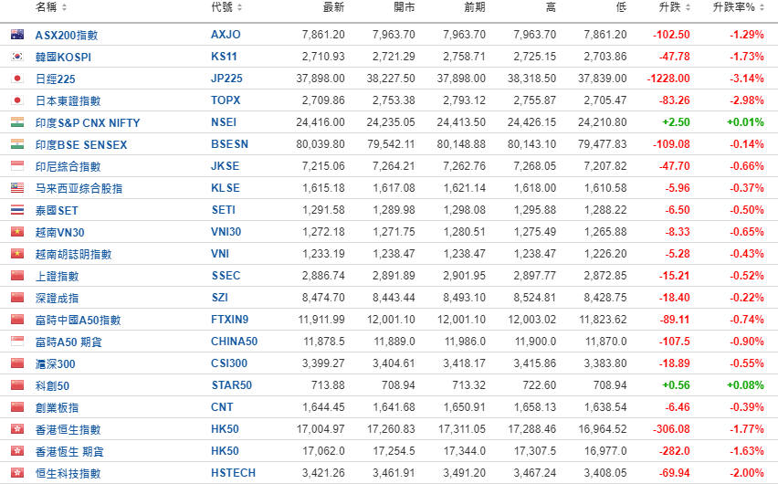 亚太股市普跌,日经225指数大跌3%,上证综指跌0.5%,失守2900点,恒生指数跌1.77%,恒生科技指数挫2%。