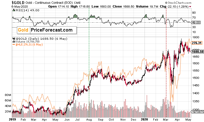 特别值得关注的是2008年——在2008年10月降息后,黄金价格骤跌,黄金股也一样。2020年的情况也相当有趣。