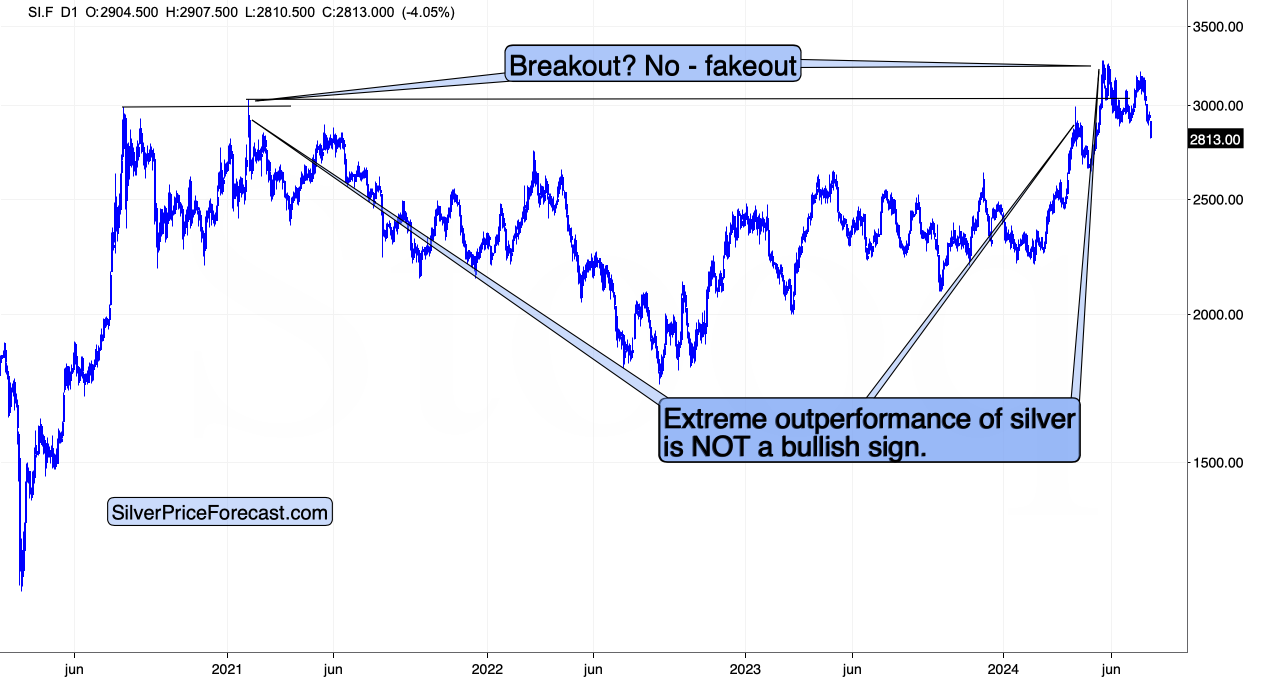 与此同时,白银也大幅下跌。尽管白银第二次尝试突破30美元,但显然无法站稳这一价位。白银也未能突破2020年和2021年高点,强烈证明白银已经见顶,而黄金也可能一样。