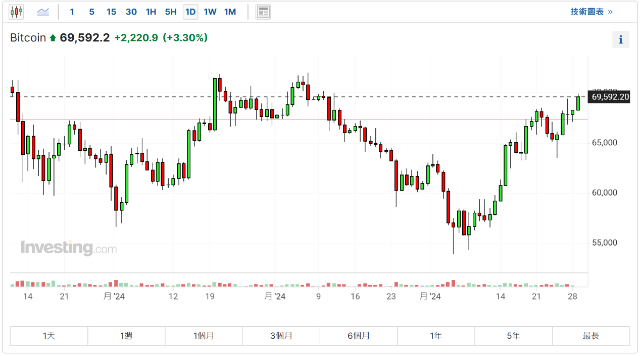 根据Investing官网显示,在24小时内,比特币上涨3.3%,飙升近1340美元,报69592.2美元。盘中最高点至69861.7美元,触及近七周高点。