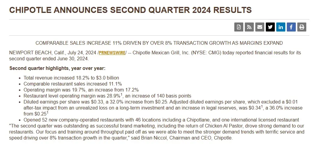 而广受好评的墨西哥盖浇饭CMG的业绩更强,在整个环境不好的情况下,加速成长,Q2收入增18%,利润增33%,同店销售额增11%,价廉物美的特性使得其渗透率加速提升,但过往对成长性的定价不低,一直是40倍左右,所以也遇到了杀跌,6月以来也是跌20%,这个公司基本是美股餐饮成长龙头,这样的跌幅也是挺罕见了。这样的Q2收入和利润放在40倍PE的科技股上,能这样跌?