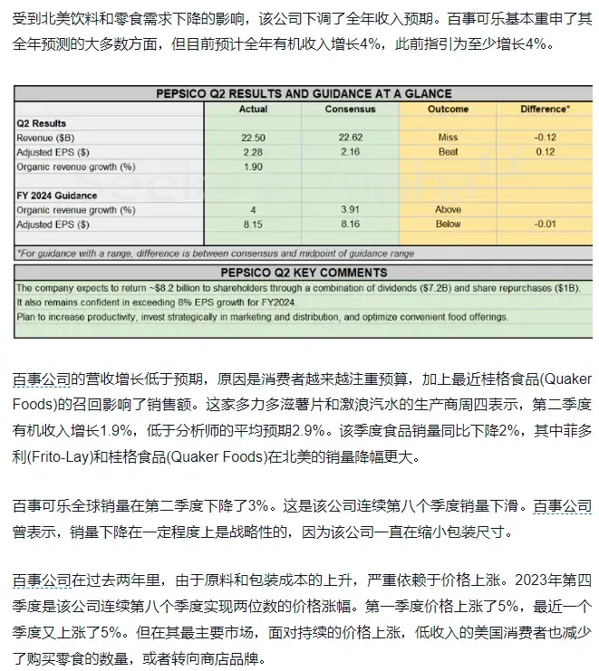 首先看到今年以来各类消费公司的表现。不难发现,多家大型食品饮料及餐饮公司是下跌的,比如,麦当劳、星巴克。百事、百威、亿滋。而近期,达美乐和墨式烧烤两家头部美国快餐公司也发生了大幅度的下跌。具体原因都是业绩不达预期。