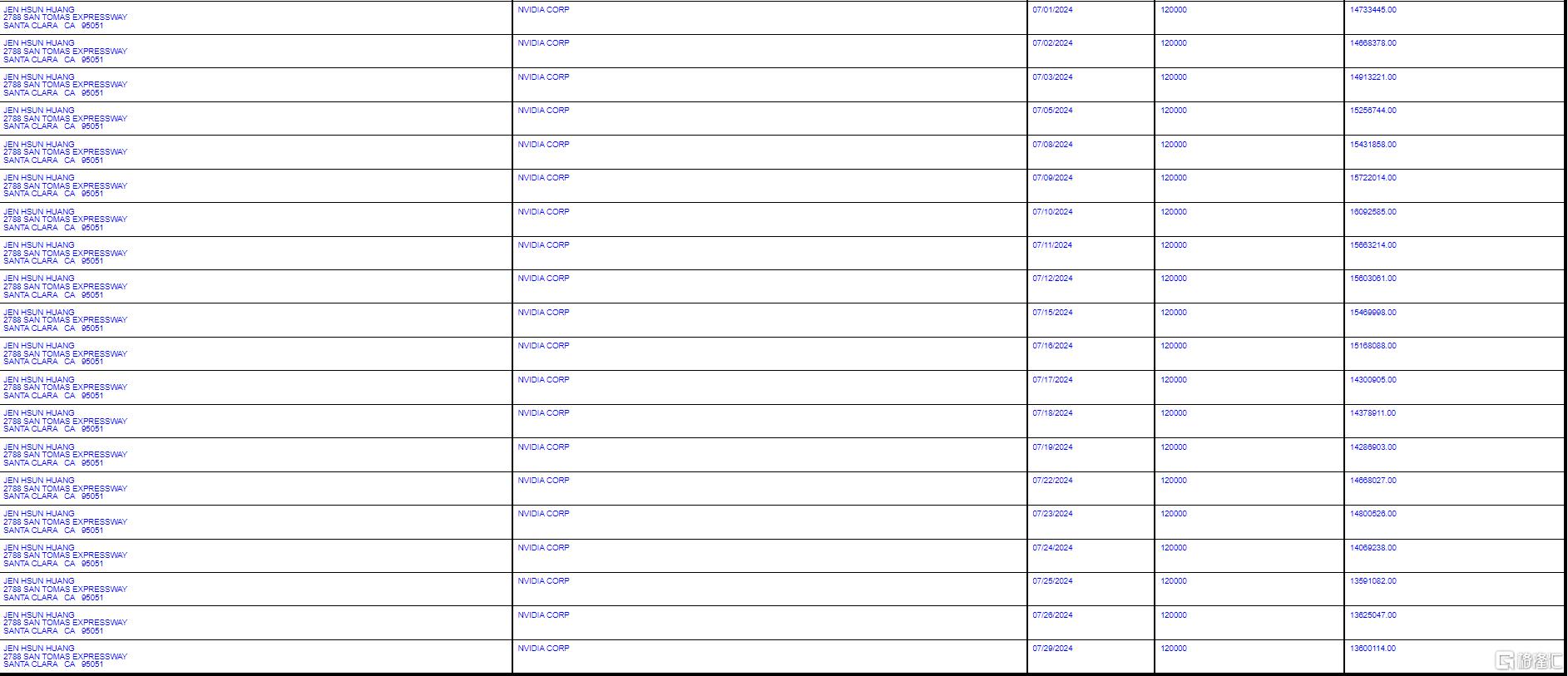 而截至目前,7月黄仁勋已经多次出手,每笔套现均在1300万美元至1600万美元之间,总金额接近3亿美元。此外,英伟达高管也有卖出交易。
