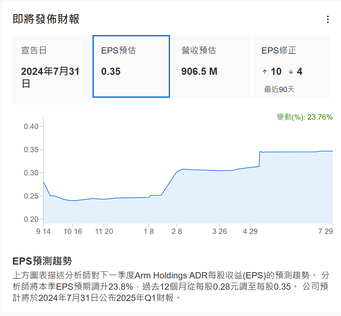 ARM二季度有望受益手机市场的复苏,目前,根据InvestingPro工具预测,每股收益为0.35美元,同比下降2.8%,营收将达到9.06亿美元,同比增长12.4%!高盛预计, ARM二季度业绩和指引将双双超过市场预期。