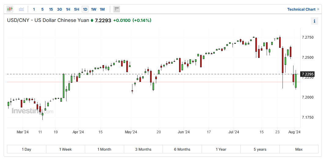 在岸人民币汇率日线图,来源:英为财情Investing.com