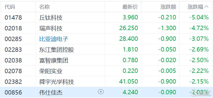港股苹果概念集体飘绿,丘钛科技跌超5%,瑞声科技跌超4%,比亚迪电子跌超3%。