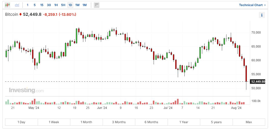 自周五以来,比特币以及更广泛的加密货币市场一直在追随股市大跌,此前美国一系列疲软的经济数据加剧了人们对潜在衰退的担忧。