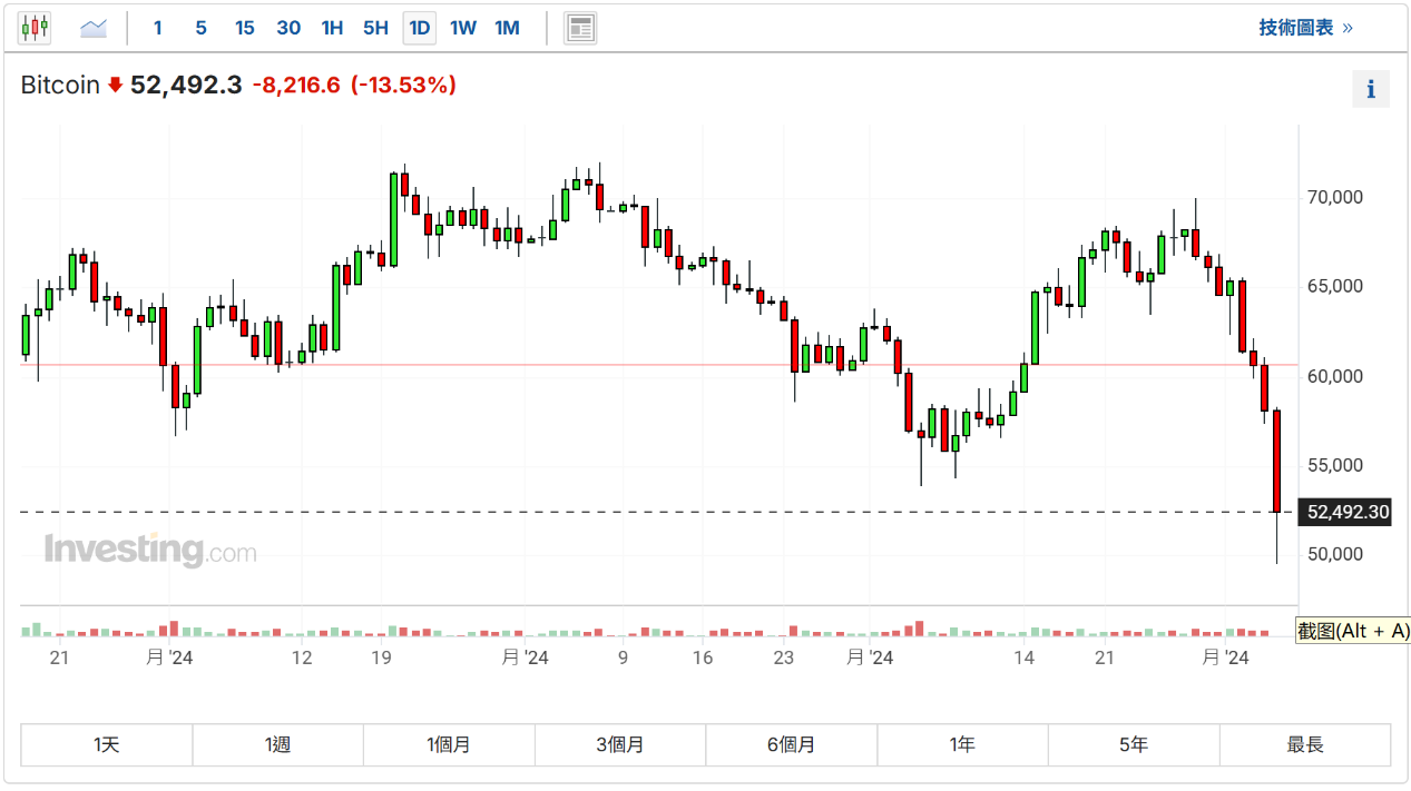 消息面上,8月5日,比特币一度跌破50000美元,日内大跌16%,创2月份以来新低。据CoinMarketCap数据,一天之内,加密货币总市值蒸发约3000亿美元。据 Coinglass 数据,过去24小时内虚拟货币市场近20万人爆仓,爆仓总金额7.65亿美元。