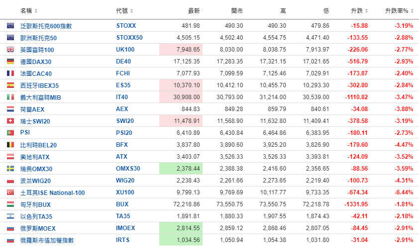 欧洲股市集体大跌,英为财情Investing.com欧股行情显示,欧洲基准指数泛欧斯托克600指数跌幅扩大至逾3%。