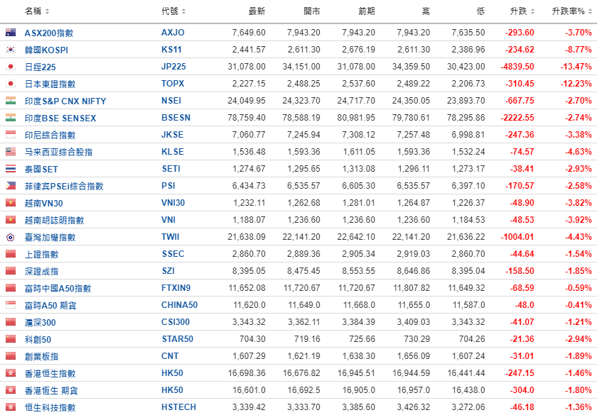亚太股市亦无一幸免,日经225指数暴跌13%,上证综指跌1.5%,恒生指数跌1.5%,恒生科技指数跌1.4%,越南VN30指数跌3.8%。