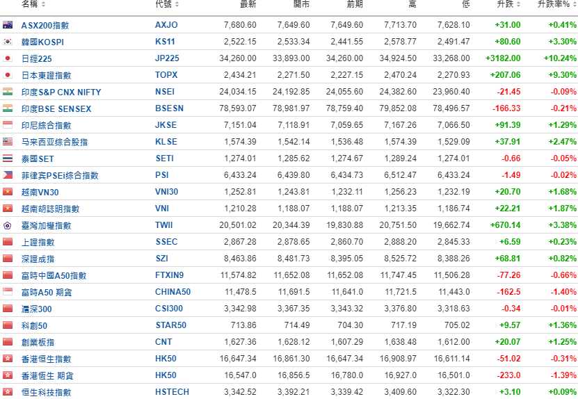 亚太股市多数反弹,日经225指数飙升10%,东证指数升9.3%。
