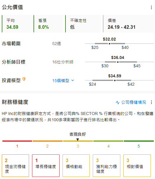 惠普目前的增长潜力疲软,分析师平均目标价36美元,相比现价上升空间并不多。